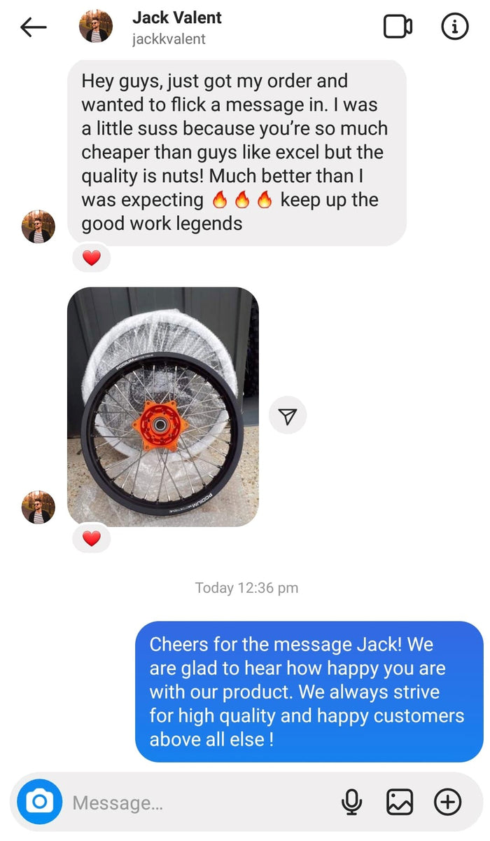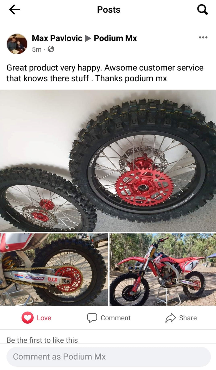 Here at Podium MX we strive to get the highest quality parts and materials to you at Australian whole sale prices. The motorcycle industry is infamous for high mark up prices on their products. At Podium MX we cut out the middle man going direct from factory to customer! This allows us to keep the prices lower for you whilst maintaining the high quality you deserve.